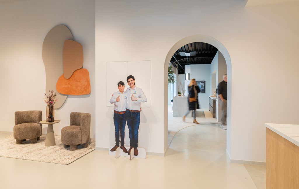 “Stap voor stap vernieuwen we ook onze bestaande toonzalen”, zeggen marketeer Frederik Vanbelle en visual marketeer Lukas De Groodt. “Elke toonzaal presenteert 20 tot 25 verschillende keukens. We spelen in op nieuwe trends: vandaag vooral de Japanse en Scandinavische toets, met beige en grijze tinten. De trendkleur van 2024 is ‘Toendra’, een grijsgroene tint. Maar eigenlijk zijn er geen beperkingen: bij ons kunnen klanten alle elementen combineren naar eigen wens.”